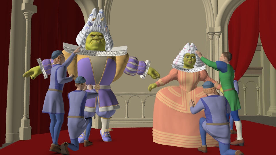 It isn't just the challenge of animating some clothing, it's how much clothing. “We have a lot more characters in the same shot”, notes Shrek 3 Co-Director Raman Hui. “Shrek 3 has a huge cast with 48 characters”, says Shrek 3 Director Chris Miller. “We have huge crowd scenes with 40 to 50 characters on a stage and 2,500 in the audience.” “The challenge in crowds is each character needs to look different”, says Pearce.