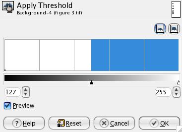 Figure 1. Threshold dialog in The GIMP. Slide the triangle left and right to choose what pixels should be white and what pixels should be black.