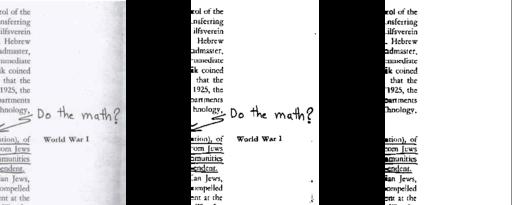 This page had handwritten notes, underlining and a section of lighting that threshold could not get rid of without compromising the rest of the image. Use a brush to paint over any easy-to-fix areas. I would not recommend spending much time on cases where the extraneous information (figure, noise and so on) has some distance from the text; Tesseract might insert a few garbled characters, but those are usually quicker to fix in a text editor. The resulting image should look something like the third part of Figure 2.