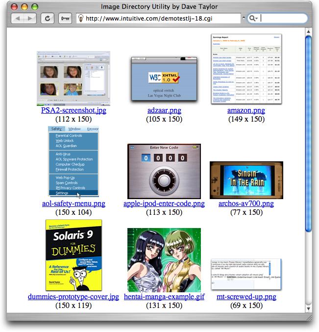 The full script is pretty cool. If you'd like to get a copy of it, please pop over to my site: www.intuitive.com/wicked/imagedir.txt. Save it as index.cgi in an image directory on your Web server.