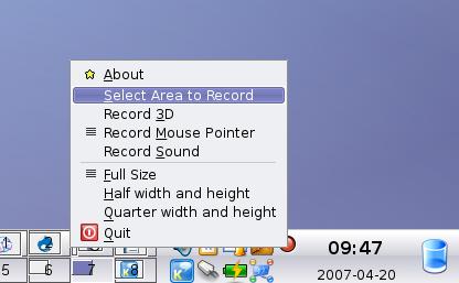 To start Istanbul, simply run the command name, istanbul. When you do, a small red icon appears in the system tray. Right-click on the system tray icon (a small red circle at this point), and a small pop-up menu appears (Figure 1). From here, you can make a number of changes in Istanbul's default recording. For instance, you may choose to make a smaller recording by selecting half width and height instead of full size. You also can choose to record your entire desktop or select a specific area to record. If you do the latter, Istanbul provides you with a large X cursor that you can drag around the area you want to record.