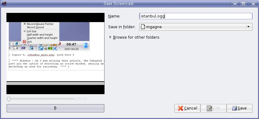 On the left-hand side of that dialog, there's a preview window showing your captured video. To preview it before saving it, click the Play button below the preview window. On the top left, you can enter a file for your video and select a folder in which to save it. As you might have guessed from the save dialog, this is a GNOME application, but it works very well under KDE also.