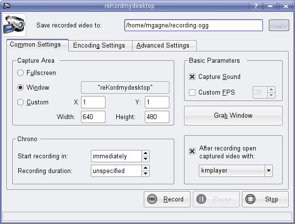 As you can see, the GUI does add some great flexibility, starting with a definable location and name for your OGG file. Everything you need is covered under these three tabs, although most of what you'll want is on the Common Settings tab. Let's look at a few of those, starting with sound. To record audio, make sure you click the Capture Sound check box. You can specify a time delay to your recordings—you can screencast reKordmydesktop, so you may want to minimize it first when capturing the whole desktop—or set a time limit on the recording (look in the Chrono section). By default, reKordmydesktop captures the entire desktop. To select a window, click the Grab Window button on the left, and click on the program window you want to capture (again, you even can click reKordmydesktop if you choose). To start recording, simply click the Record button.
