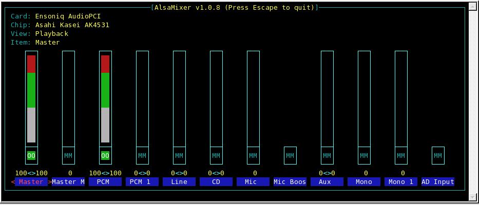 Once I had everything set up and running, I spent a fair amount of time fine-tuning the audio. The first thing I found was that the audio level was quite low. Normally, when I want to turn up the audio level, I use KMix. But, I hadn't installed a window manager on my encoding computer. My system uses ALSA as the sound system, and I found out that there is a great curses-based mixer for ALSA named Alsamixer. It allows you to use the arrow keys to change settings. Figure 4 shows the settings I chose for my card. My final preference was to have the Master and PCM both at 100%. I also chose to mute everything else, because I knew they would not be in use.