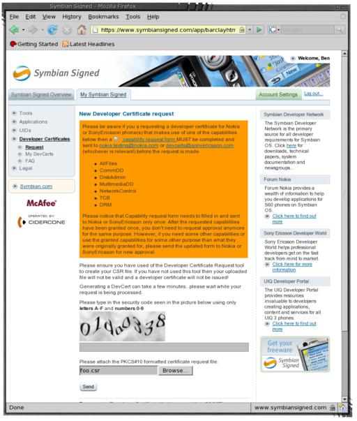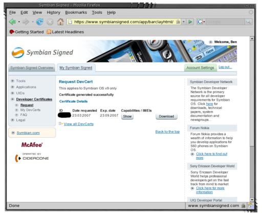 To create the certificate itself, you have to return to symbiansigned.com and upload the csr file. First log in, and then select the My Symbian Signed tab. In the side panel, the Developer Certificates option has the Request sub-option. At the bottom of this page, you can upload the csr file (Figure 2). The next page allows you to download your certificate (Figure 3).