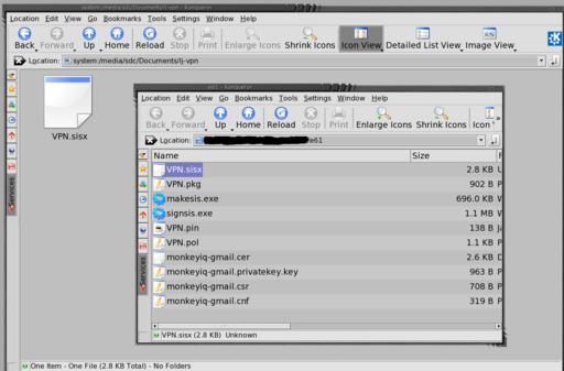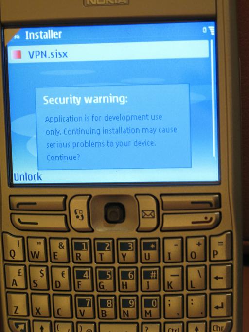 Unlike the other network settings on the phone, you cannot configure the VPN manually using the e61 itself. You have to create a package containing all the information about the VPN and install that package on the phone. These packages are the SIS files. A VPN SIS file also must be digitally signed before the e61 will allow you to install it. Signed SIS files normally have an sisx extension. The most difficult part of setting up the e61 to talk to Openswan is in creating the sisx file to install on the phone.