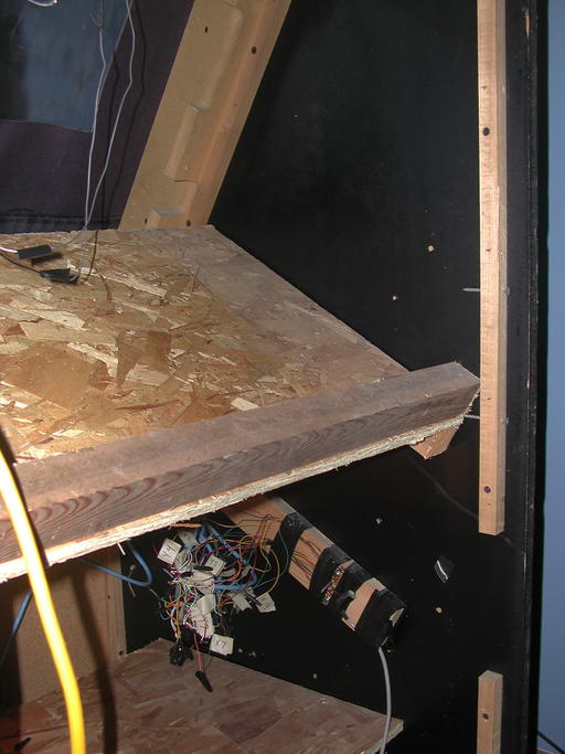 Now you should have a mostly empty case with a monitor shelf, computer shelf and a wooden control panel full of holes. If you are doing this work in the house, and you happen to be married, take this time to vacuum. You can thank me later.
