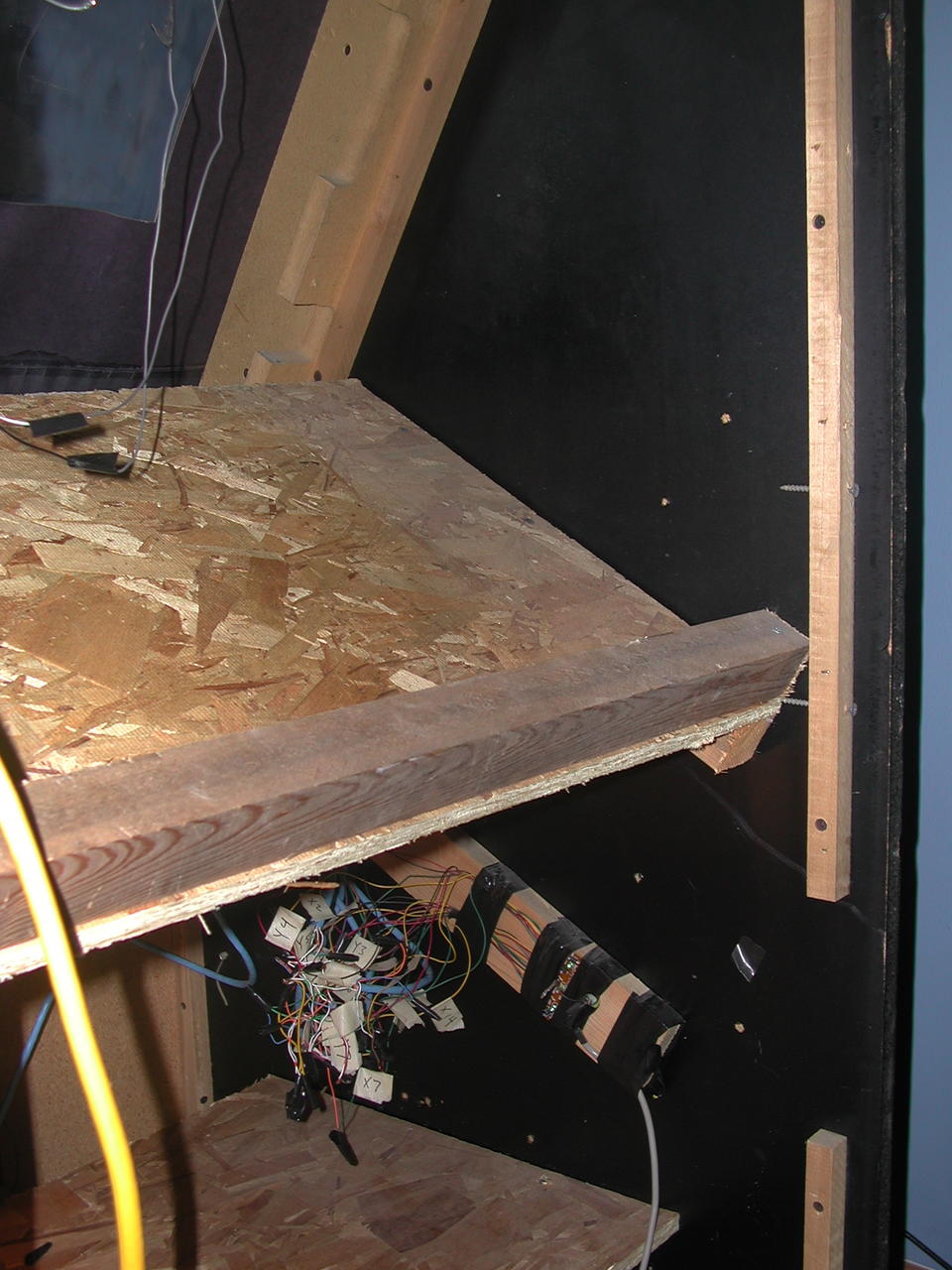 The most difficult part of construction, for me, was getting the monitor properly mounted. I used an old 17" Apple monitor that was destined for the trash. As you can see in Figure 2, the monitor shelf has to be at the right angle so that the face of the screen is flush with the Plexiglas front. I'm sure there are woodworking shortcuts for figuring out how to get the angle correct, but I ended up with some really complicated geometry equations involving SINE and COSINE. Yep, I'm a geek.