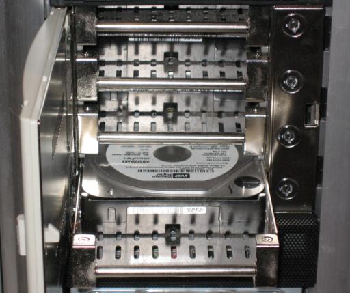 Some might consider a RAID cage to be frivolous. But this is the Ultimate Box after all, so we're including the 3ware RAID cage that lets you hot swap four drives in the space of three 5.25" drive bays. Aside from easy drive replacement, the RAID cage has two advantages over mounting the drives normally. First, the 3.5" hard drive cage in the case fits only two drives if you want good air circulation. You would have to mount at least two of the drives in the 5.25" area, and then add drive fans if you want to keep them cool. The RAID cage lets you pack all the drives in one small space, and it comes with its own set of fans to keep them cool. The cage also requires only two power sources, instead of one for each drive.