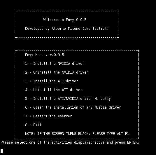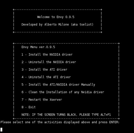 Use the command envy -t to run Envy with the text-mode interface. This is especially useful if you weren't able to get a graphical desktop running at all, because you can run this from a text console. It works just as well in a terminal window on a graphical desktop though. See Figure 1 for a picture of the text-mode main menu.