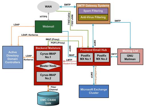 Before we zoom further into our new e-mail system, I want to mention some of the existing Linux/UNIX e-mail solutions in higher-education environments. First, the HEC Montréal e-mail system discussed in a Linux Journal article (see Resources) influenced our design, which is based on Cyrus-IMAP and Postfix. Second, we looked into Cambridge University's solution. It uses custom IMAP proxy front-end servers and multiple pairs of Cyrus-IMAP mail store servers replicating data to each other. Furthermore, Carnegie Mellon University (CMU), which originally developed Cyrus-IMAP, uses Sendmail as the front-end mail exchanger and a Cyrus-IMAP Murder Aggregator setup on the back end. Columbia University moved its e-mail system to a Cyrus-IMAP-based solution in 2006, and the University of Indiana moved to Cyrus back in 2005. Cyrus and Postfix also are used by Stanford University.