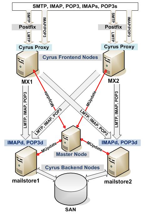 So, the Cyrus-IMAP Aggregation approach was adopted. Figure 4 illustrates the setup: two Cyrus back-end servers were set up, and each handles half the user population. Two Postfix MTA front-end nodes are designated to serve the proxy functions. When e-mail clients connect through SMTP/IMAP/POP3 to the front-end servers, the Cyrus Proxy service will communicate with the Cyrus Master node using the MUPDATE protocol, so that it gets the information about which Cyrus back-end node stores e-mail for the current client. Furthermore, the back-end Cyrus nodes will notify the Master node about the mailbox changes (creating, deleting and renaming mailboxes or IMAP folders) in order to keep the Master updated with the most current mailbox location information. The Master node replicates these changes to the front-end proxy nodes, which direct the incoming IMAP/POP3/LMTP traffic. The MUPDATE protocol is used to transmit mailbox location changes.