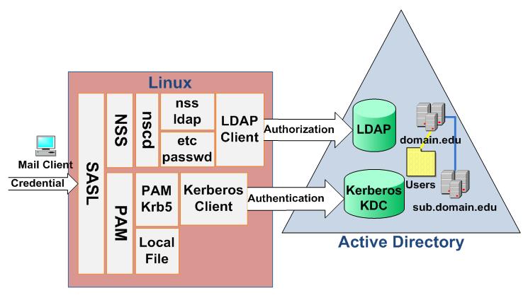 One of the requirements of our new e-mail system is to integrate user identities with the university directory service. Because Microsoft Active Directory services have been made a standard within our centralized campus IT environment, Cyrus (IMAP/POP3) and Postfix (SMTP) are architected to obtain user authentication/authorization from AD. After the integration, all e-mail user credentials can be managed from AD. Most directory services are constructed based on LDAP. AD uses LDAP for authorization, and it has its own Kerberos implementation for authentication. The goal of an integrated AD authentication is to allow the Linux e-mail servers to use AD to verify user credentials. The technology used to support the AD integration scheme is based mainly on the Kerberos and LDAP support, which come with native Linux components, as shown in Figure 5.