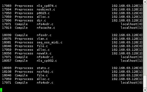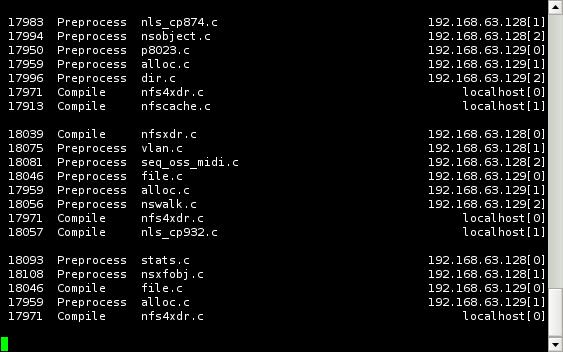 distcc includes two monitoring tools that can be used to watch the progress of compile jobs. The console-based distccmon-text is particularly excellent if your master host is being accessed via SSH. As the user the compile job is running as, execute the command distccmon-text $s, where $s is the number of seconds at which you would like it to refresh. For example, the following: