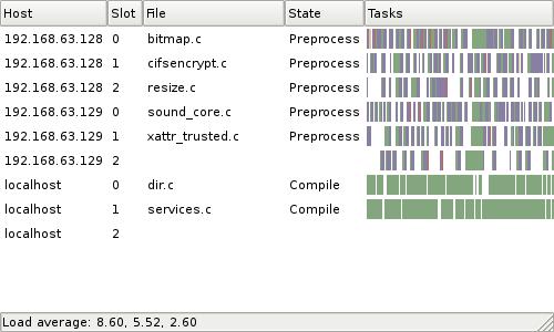 The graphical distccmon-gnome is distributed as part of distcc if you compile from source, but it may be a separate package depending on your distribution. It provides similar information in a graphical display that allows you to see at a glance which hosts are being heavily utilised and whether jobs are being distributed properly. It often takes a few tries to get the order of hosts at the most optimal—tools like distccmon-gnome make it easier to see whether machines are being under- or over-utilised and require moving in the build order.