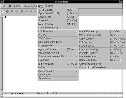 Although Org-mode provides a graphical menu, in this article I refer to Org-mode keyboard commands only. Once you get familiar with Org-mode keystrokes, you will find them to be more efficient than the graphical menu.