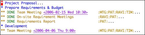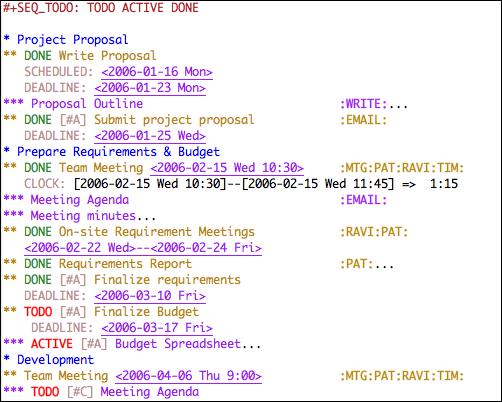 Figure 10 shows a fictional example that illustrates some of Org-mode's planning and scheduling features. This Org file uses a custom to-do work flow, which is specified at the top of the file. Task are marked with work-flow states. Major project phases are outlined some with scheduled or deadline dates. Tags are used for marking activity type and team member responsibilities. Dates and times are marked for meetings. A clock timestamp is used to track time spent on a meeting. The “On-site Meetings” entry uses a date range because it spans multiple days. High and low priority markers help prioritize tasks. Folded away from view are the project proposal, meeting minutes, reports and a budget spreadsheet. Everything related to a project can be kept in one file.