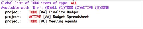 Org-mode's Agenda feature offers other views, such as a list of all to-do items or an agenda-like display of entries and their dates. First, you need to add your Org file to your Org agenda by using the command C-c [. Then, type C-c a to be presented with options for different views. For example, to see a to-do list of the fictional project shown in Figure 10, type C-c a t (Figure 12). You also can generate views based on tags (Figure 13).