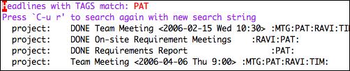 Since Org files can get large, Org-mode provides mechanisms to generate different views of an Org file showing only the information you are interested in. In Figure 10, if you want to search for all entries with the tag PAT, use the command C-c \ and type in PAT (Figure 11).