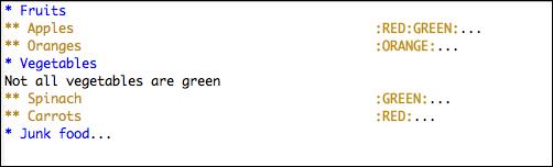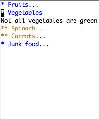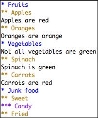 Outlining is an effective technique for organizing thoughts, taking notes or writing articles. Emacs has a built-in outline-mode that stores text as entries. Each entry has a headline and a body. Entries can be nested to create a tree of hierarchical information. Emacs uses asterisks (stars) to denote the hierarchy of an outline tree. Lines that do not begin with a star are considered to be the body of the headline above it. In the following example, ** Apples is a headline. Apples are red is the body for the Apples headline.