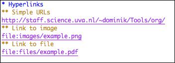 Org-mode recognizes URLs and turns them into clickable links. If Emacs knows your default Web browser, clicking on URLs in Org-mode opens up the link in your default Web browser. Org-mode supports other types of external links, including links to files and images (Figure 6).