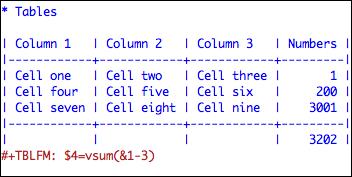 Org-mode includes a table editor that makes it possible to format tables in plain ASCII text. Using | as a column separator, Org-mode automatically reformats the plain-text table to realign columns or add new rows. Use Tab to move to the next cell and Shift-Tab to move to the previous cell. Org-mode helpfully right-aligns numbers. You can do spreadsheet calculations in these plain-text tables by inserting formulae within cells (Figure 7).