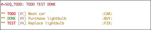 Once you create tasks, you will need to prioritize them. Org-mode supports three priority levels: A, B and C. A is the highest priority. Priority for a task can be set by adding [#A] to a headline. The command C-c also can be used to set priorities. Figure 9 shows an example of a task list using tags, a custom to-do work flow and priorities.