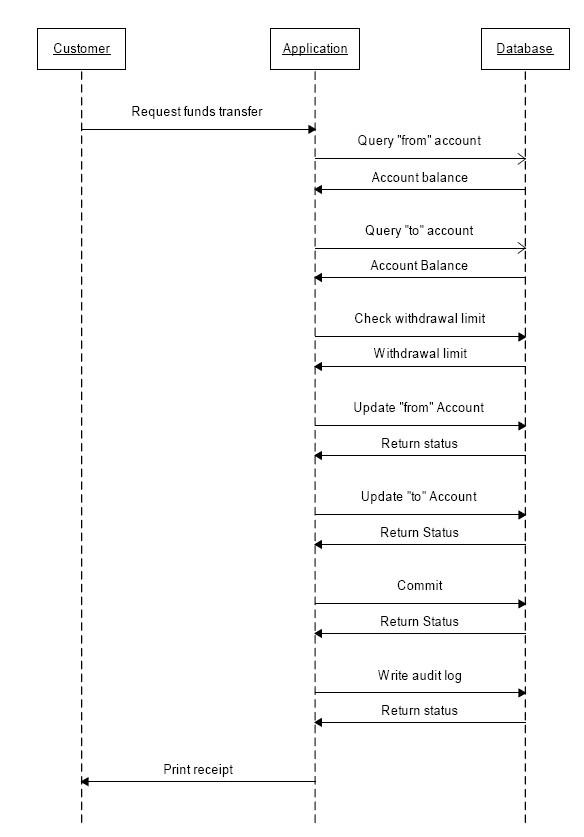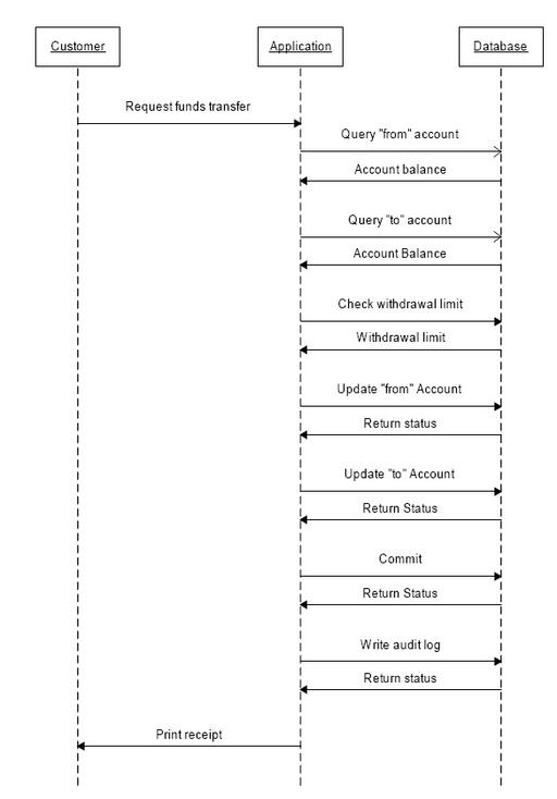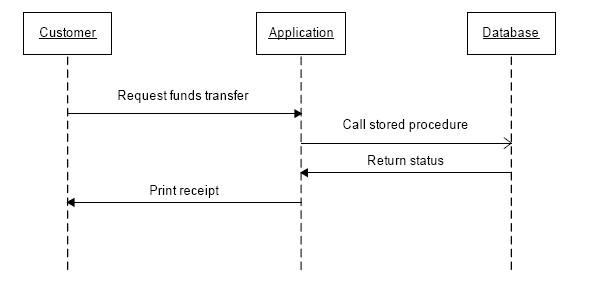 Consider a typical interaction between a bank customer and an ATM machine. The user requests a transfer of funds between two accounts. The application must retrieve the balance of each account from the database, check withdrawal limits and possibly other policy information, issue the relevant UPDATE statements, and finally issue a commit, all before advising the customer that the transaction has succeeded. Even for this relatively simple interaction, at least six separate database queries must be issued, each with its own network round trip between the application server and the database. Figure 1 shows the sequences of interactions that would be required without a stored program.
