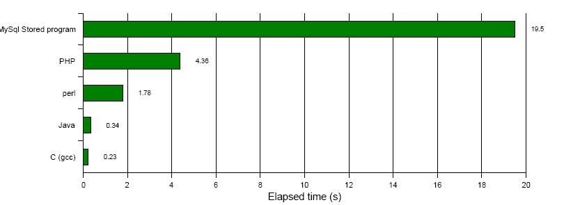 Still, it's important to get a sense of the raw performance of the language. First, let's see how quickly the stored program language can crunch numbers. The first example compares a stored procedure calculating prime numbers against an identical algorithm implemented in alternative languages.