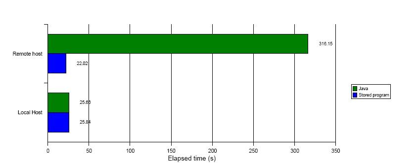 If the previous example left you feeling less than enthusiastic about stored program performance, this next example should cheer you right up. Although stored programs aren't particularly zippy when it comes to number crunching, it is definitely true that you don't normally write stored programs simply to perform math; stored programs almost always process data from the database. In these circumstances, the difference between stored program and PHP or Java performance is usually minimal, unless network overhead is a big factor. When a program is required to process large numbers of rows from the database, a stored program can substantially outperform programs written in client languages, because it does not have to wait for rows to be transferred across the network—the stored program runs inside the database. Figure 4 shows how a stored procedure that aggregates millions of rows can perform well even when called from a remote host across the network, while a Java program with identical logic suffers from severe network-driven response time degradation.
