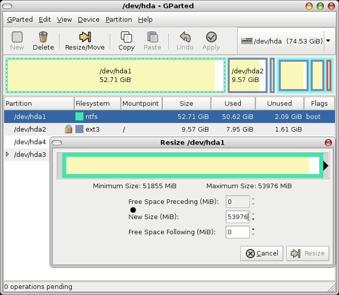 Figure 1. Resizing a Windows XP Partition Using GParted