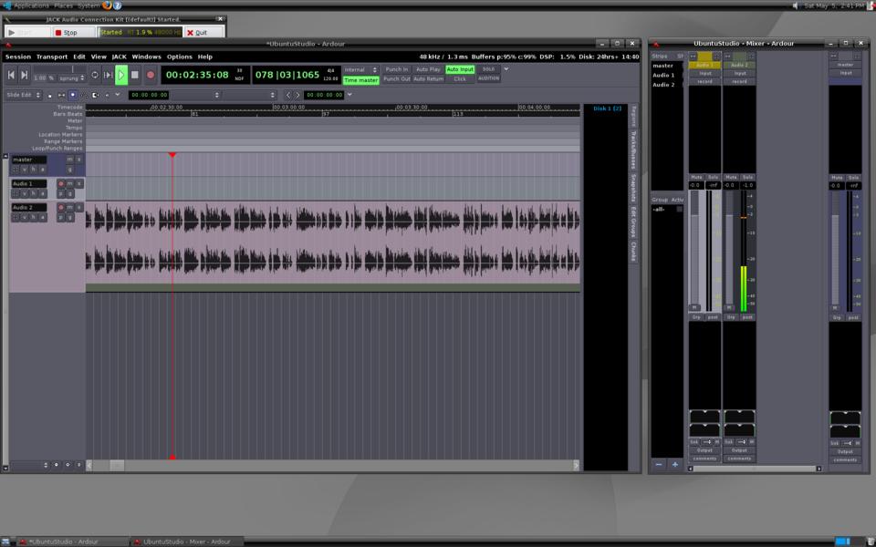 Now that the hardware is up and running, it's time to get the software whipped into shape. Pro Audio production on Linux is handled entirely through the JACK Audio Connection Kit, which allows software to access the hardware in real time through the real-time-enabled kernel. On the studio distributions, this software is installed by default, although if you intend to use the latest-and-greatest multitrack recording software we'll examine in a moment, you need to upgrade to a later version of JACK than is currently included in Ubuntu Studio.