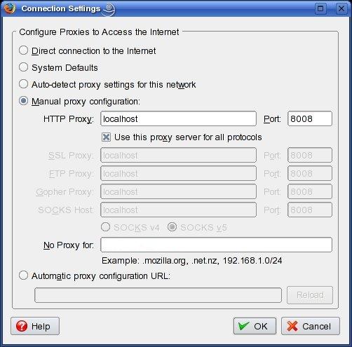 Figure 1 shows the proxy configuration screen in Firefox. Access this screen from the Edit menu: Edit→Preferences→Advanced→Network→Connection→Settings. This dialog is very similar in other browsers. If your browser's proxy configuration dialog has a proxy-exceptions field, like Firefox's “No Proxy for:” box shown in Figure 1, make sure this field is blank or that it at least does not contain the values 127.0.0.1 or localhost.