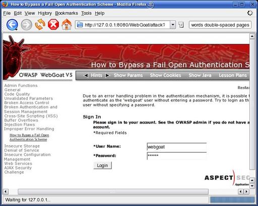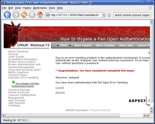 One of my favorite WebGoat lessons is the one on fail-open authentication mechanisms. If it's possible to make a user-authentication transaction fail in a way that results in successful authentication, that authentication mechanism is said to “fail open”. Needless to say, this is not the way a secure access mechanism behaves! But, it's a common Web coding mistake.