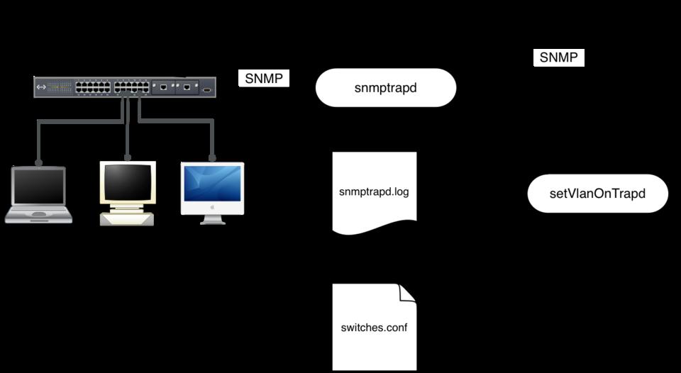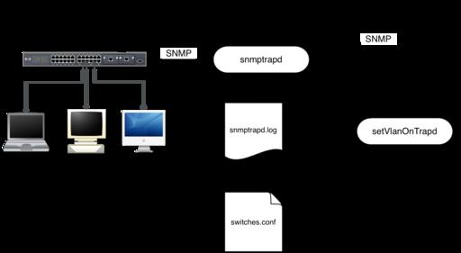 When a switch sends an SNMP trap to PacketFence, the snmptrapd dæmon receives it and writes it to the log file /usr/local/pf/contrib/log/snmptrapd.log. PacketFence's setVlanOnTrapd dæmon continuously reads this log file and, for every new trap, determines whether it needs to change a port's VLAN. If this is the case, it sends the appropriate SNMP commands to the switch.