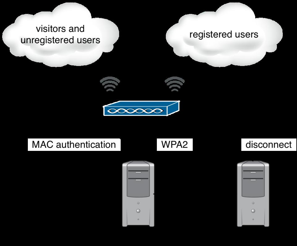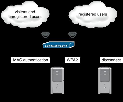 We then can configure two SSIDs on the AP, the first one reserved for visitors and unregistered clients. In this SSID, communications will not be encrypted, and users will connect either to the registration VLAN or the visitor's VLAN (depending on their registration status). The second SSID will allow encrypted communications for registered users. The VLANs here are the “normal” VLAN and the isolation VLAN (if ever there are open violations for the MAC).