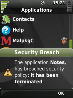 Users start an untrusted application by clicking on its icon from the main menu. In Qtopia versions previous to 4.3.0, the untrusted and installed applications were accessible from the Installed Packages application. To make sure an application tries to access only the domains it was granted, Qtopia monitors service access requests with SXEMonitor. If the application tries to access something it did not initially request, such as the phonecomm domain, a breach is registered (Figure 3). The application is terminated, and Qtopia alerts the user with a dialog. It also, however, sends the user an SMS message directly to the Messages inbox. If this application continues to create breaches, Qtopia disables the program completely.