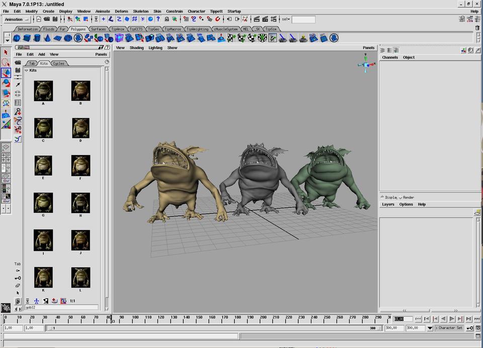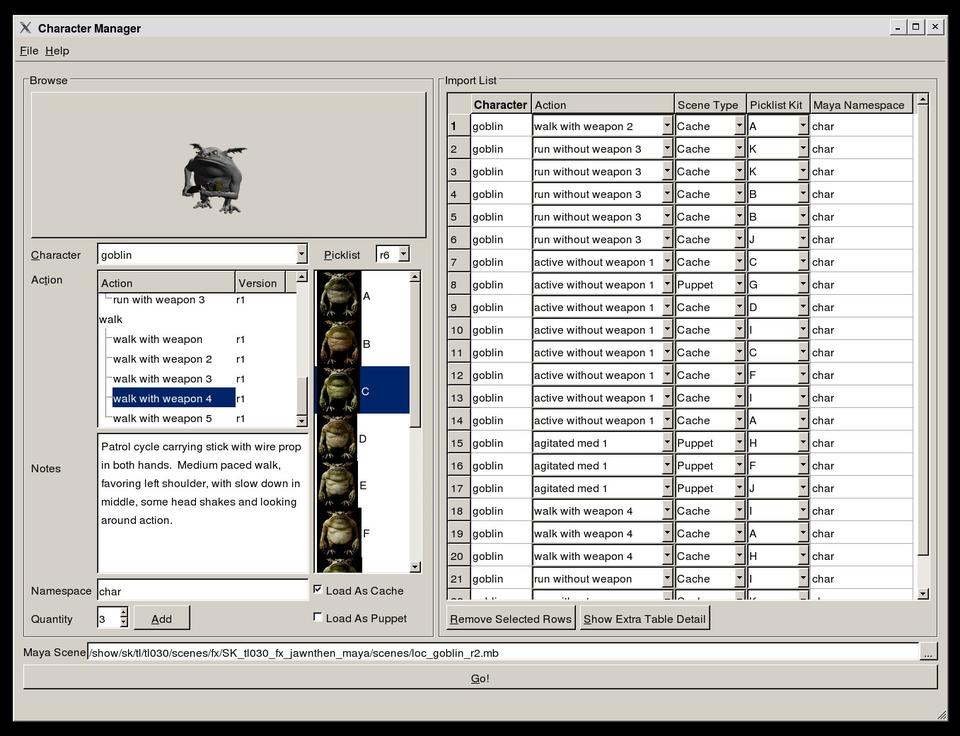 Figure 1. Tippett Studio's proprietary Creature Manager is used to maintain a library of creatures and animation cycles. The tool allows an artist to select and preview animation by pressing the larger creature button, then selecting a combination of an appropriate physical appearance for that creature from a predefined library and placing any number of selected creatures into a Maya scene.