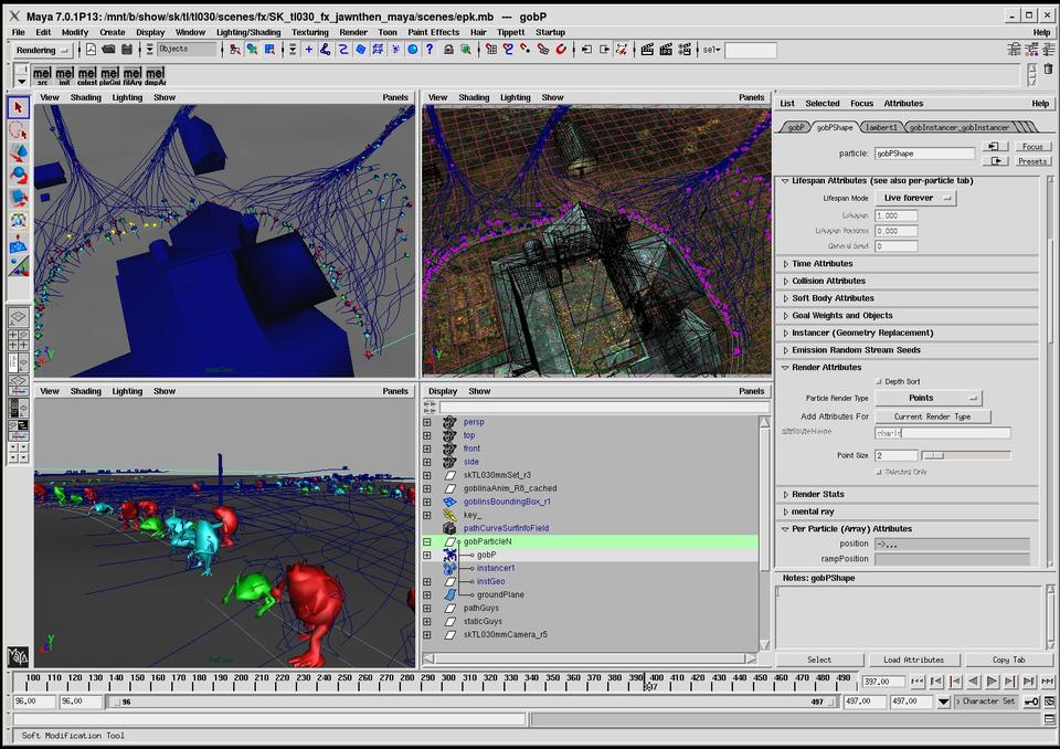 Figure 4. A view of Tippett's Swarm crowd system in Maya. The scene is choreographed by defining paths and actions for creatures to follow.