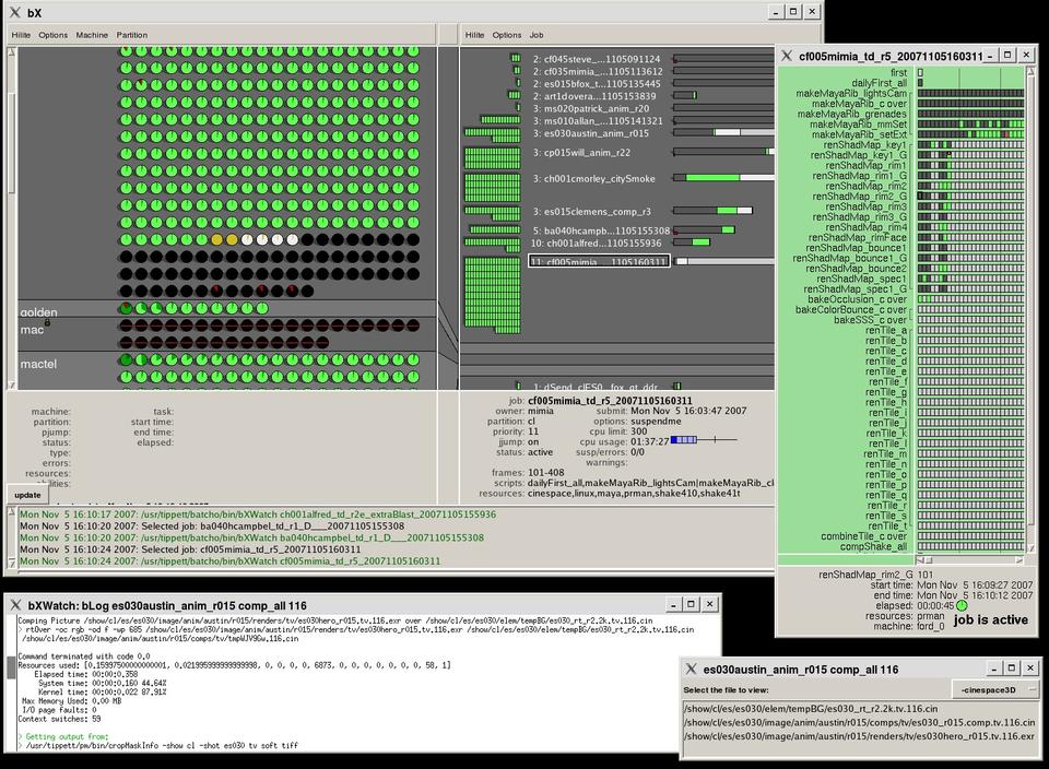 Figure 6. Tippett Studio's renderfarm is managed by its proprietary Batch-o-matic system. In its GUI interface, CPUs are represented as circles with color-coded indications of their activity level and status. Information about an artist's render jobs is represented by color-coded squares indicating number of CPUs in use, as well as an overall status bar. More detailed information is shown for a specific job, with status for each task and frame.