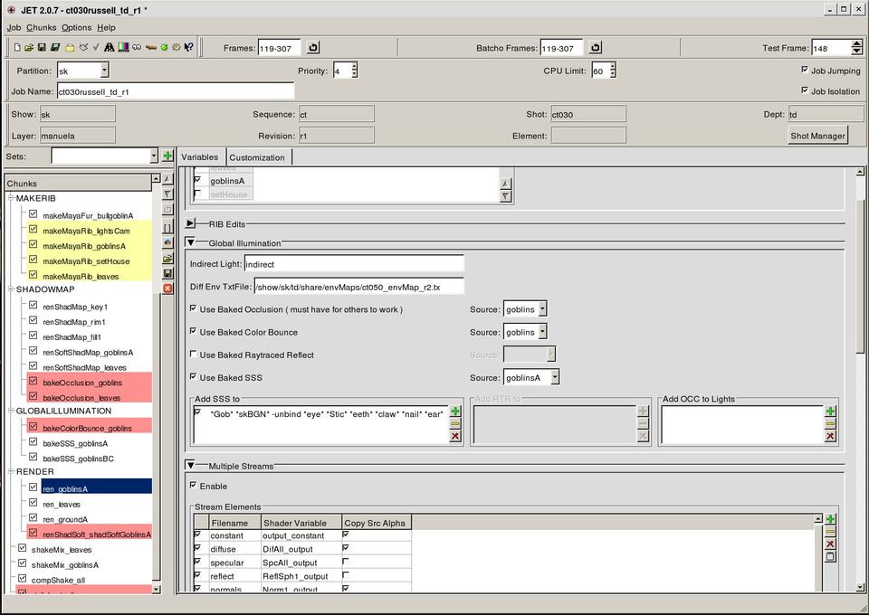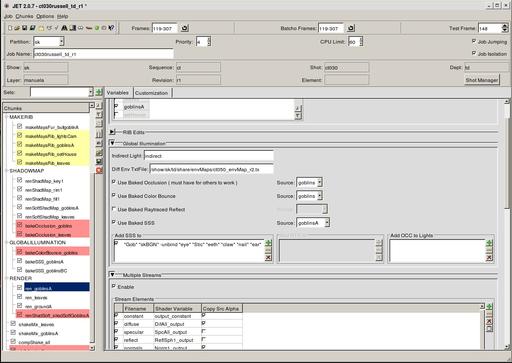 Figure 7. JET is Tippett Studio's proprietary tool for creating jobs that are to be submitted to the renderfarm. Each job comprises a series of chunks (as shown in the panel on the left) that perform specific tasks, such as making a RIB, growing fur, rendering with RenderMan and compositing with Shake. The primary work area on the right provides an interface for the selected chunk.