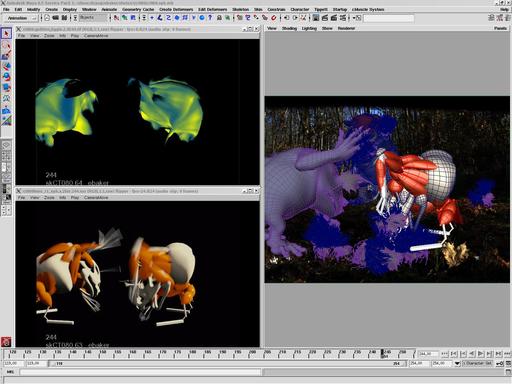 Figure 8. Creature skin, muscles and skeletal structures—the green and yellow images represent soft body jiggle maps. Along with the muscle system, we also have what is called tension controls. These are blendshapes of various body parts that when fired give those areas a more flexed look, giving the illusion of the skin tightening.