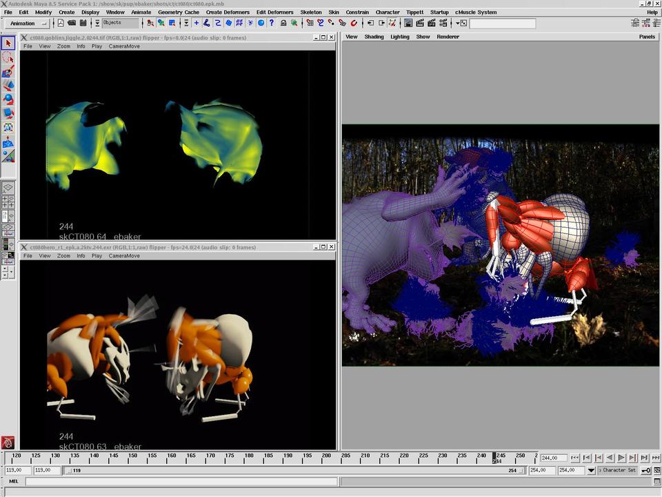 There are commercial Linux software tools available to Linux animators beyond big packages like Maya. “cMuscle is a system for simulating muscle movement”, says Darling. “We used it for muscle jiggle, skin jiggle, skin smoothing and sliding effects. We use SyFlex for the clothing worn by Red Cap and Hogsqueal. This system was augmented by some custom cloth/deformation software developed at Tippett Studio.”