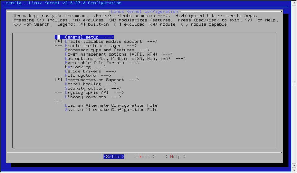 Figure 1. make menuconfig provides a console-like way to select kernel options.