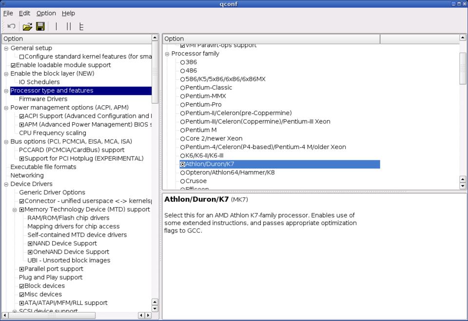 Figure 2. make xconfig produces a friendlier, graphical way to choose kernel options.