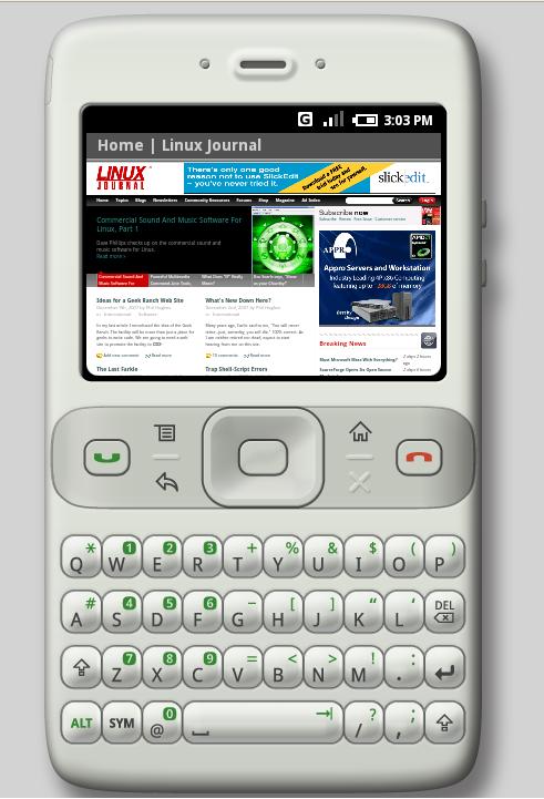 Figure 1. Browsing the Linux Journal Web site using the WebKit-based browser on the Android emulator. This particular screenshot highlights the built-in zoom feature that enables you to see a full-size view of a Web site.