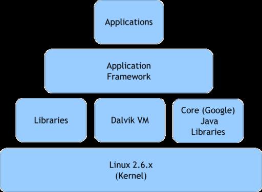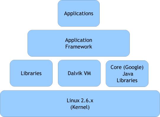 The Android framework consists of four layers, as shown in Figure 3. At the top of the stack is the aptly named Applications layer, so called because it is where finished applications are assembled and situated in the framework. The second is the Application Framework layer, where the building blocks of each application are created using the underlying system libraries and associated application code. Next comes the Library and Runtime layer where core system libraries, Google Java libraries and the Dalvik virtual machine reside. The fourth and final layer is the Kernel layer, where Linux (version 2.6.x) communicates with the underlying hardware.