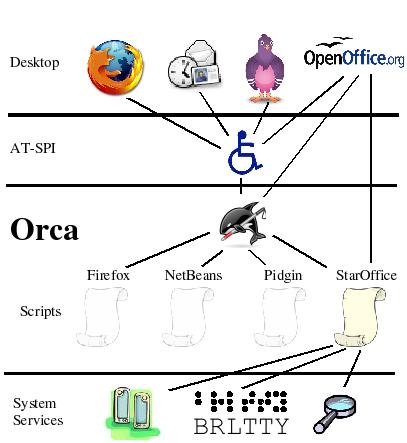 Orca is known as a scriptable screen reader, meaning it can provide customized behavior based on the application with which it is working. With Orca, custom scripts written in the Python programming language can be used to provide more compelling access to the unique interaction models of applications. For example, Orca provides a script for the Pidgin instant-messaging application to give you additional features, such as quickly reviewing the last few messages that have arrived.