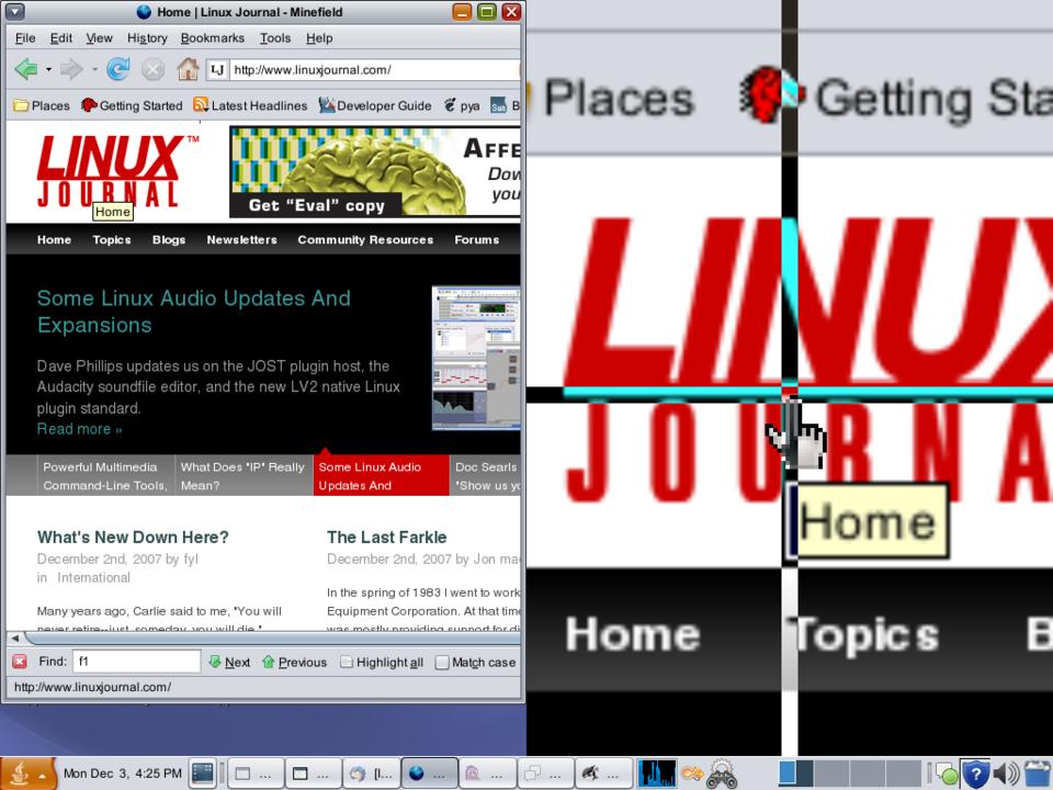 Pressing the arrow keys gives you traditional caret navigation, but the Orca script for Firefox also provides more sophisticated structural navigation. Press O and Shift-O to jump to the next and previous “large objects” on the page. On linuxjournal.com, these happen to be the article summaries. You also can press H and Shift-H to move by header and L and Shift-L to move by list. The “Firefox” page of the Orca Wiki has more complete documentation on accessing Web content via Firefox and Orca.