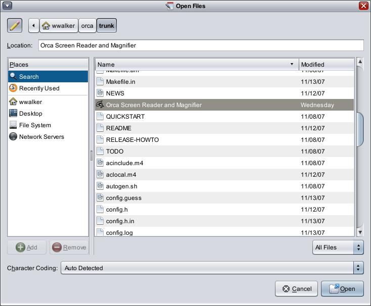 As you arrow down through the file list, Orca presents each line to you. To get out of the file list, press Tab to navigate to the other objects on the page. As you do so, Orca presents information about where you are. Notice how the Character Coding label is presented when you tab to that combo box. Mnemonics and quality keyboard traversal are good friends to a screen reader.